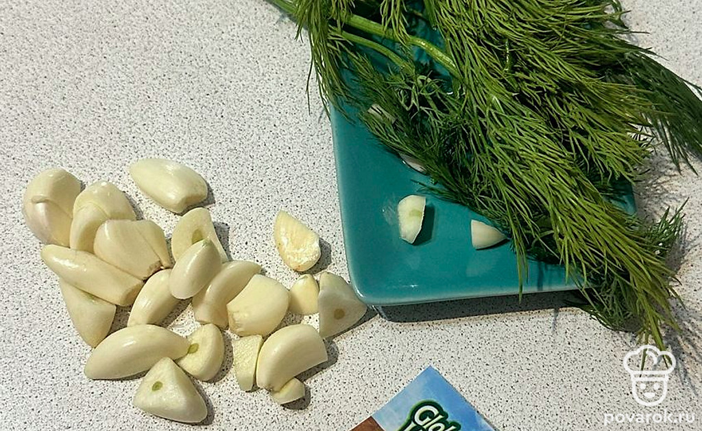 Подготовим и очистим чеснок. Укроп промоем водой.