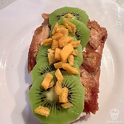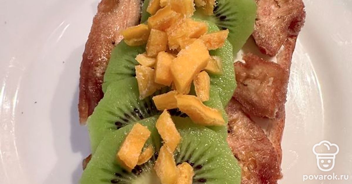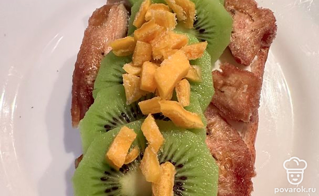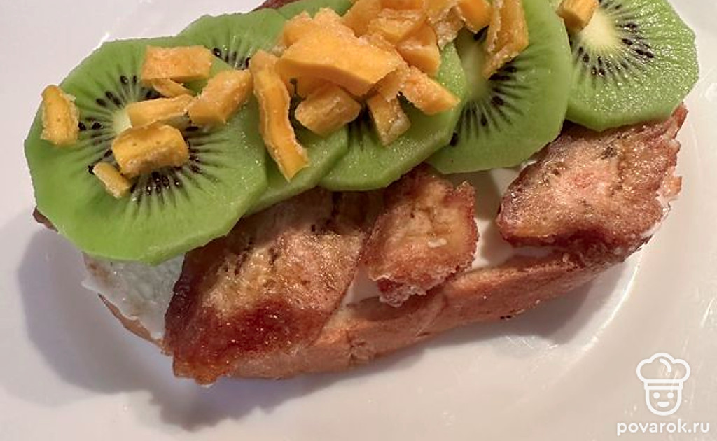 Сушеное манго нарезаем мелкими квадратиками, выкладываем на бутерброд.