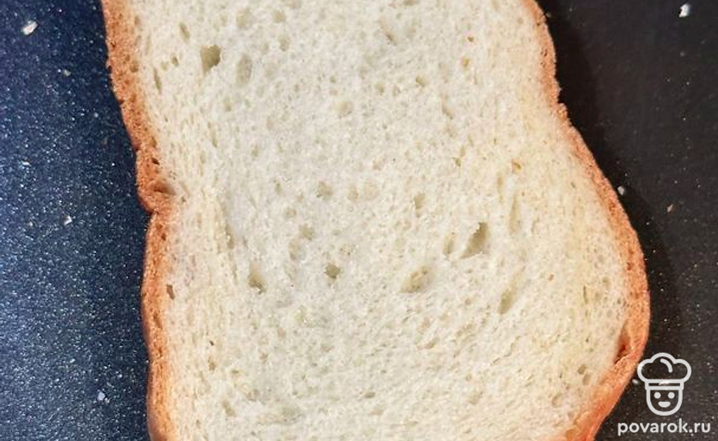 Ломтик хлеба обжариваем на сковороде 4 минуты (на медленном огне).