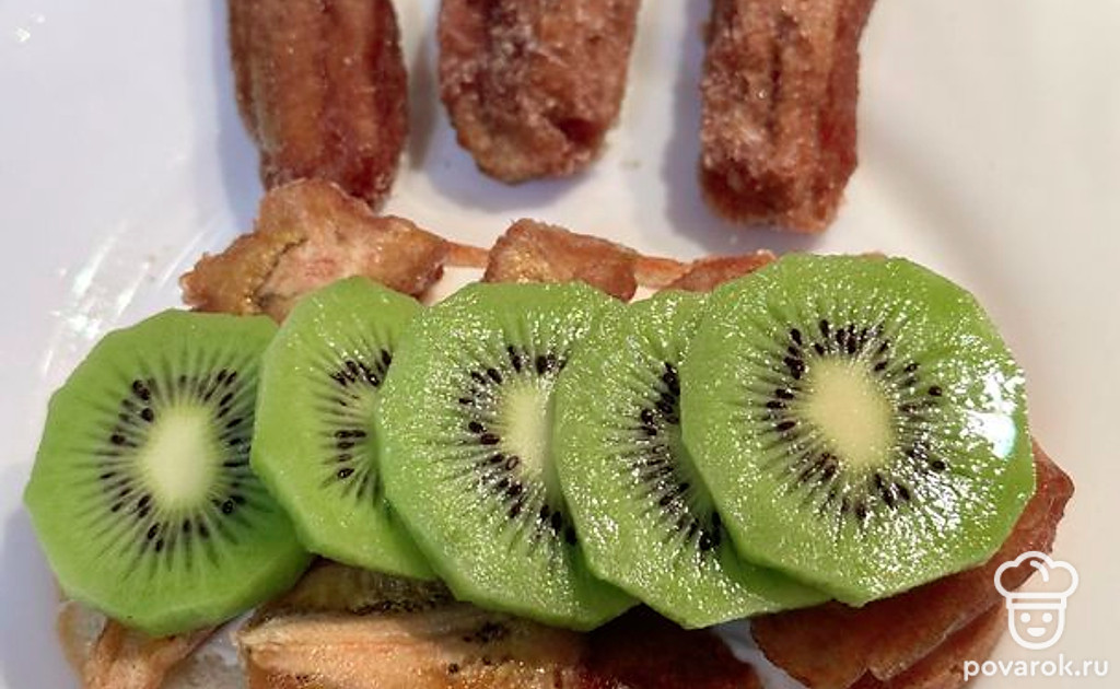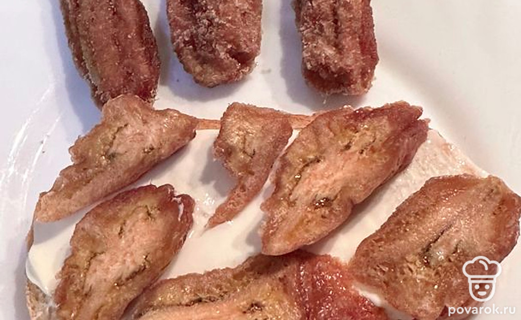 Остывший хлеб смазываем творожным сыром. Вяленые бананы нарезаем кружочками, выкладываем на бутерброд.