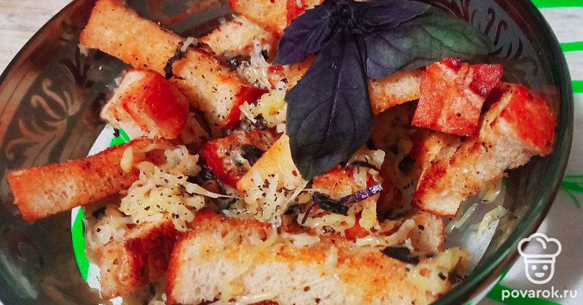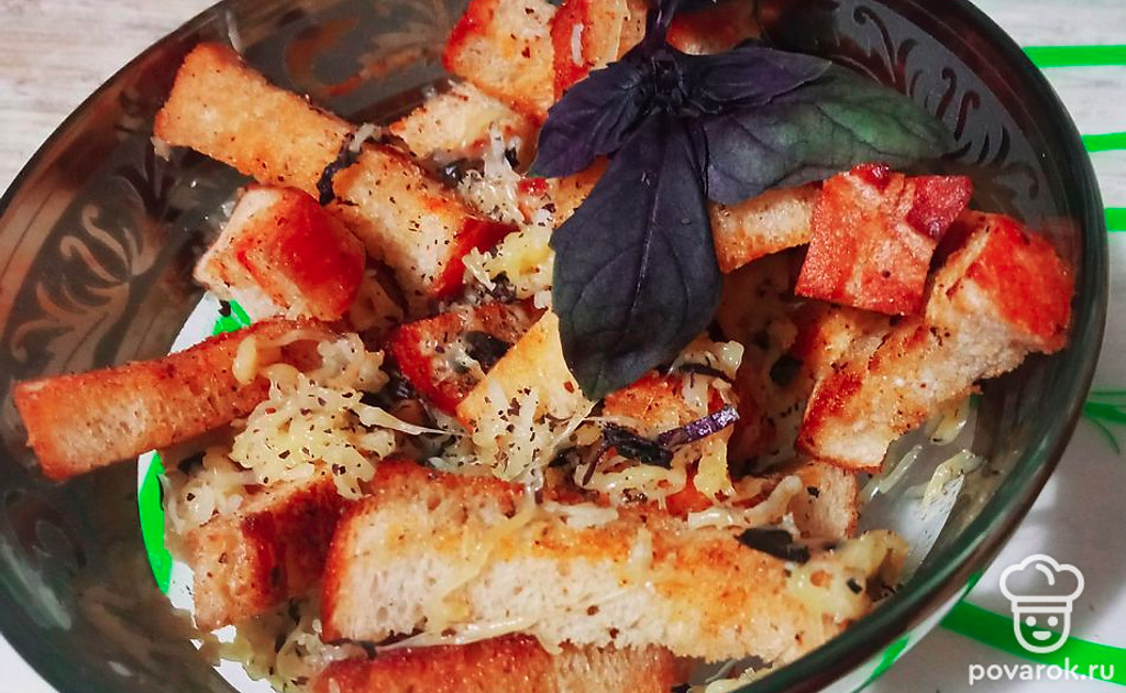 Выкладываем гренки в посуду, пересыпая сырной смесью. Если сыр не расплавился, можно подогреть в микроволновке.