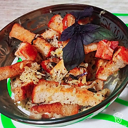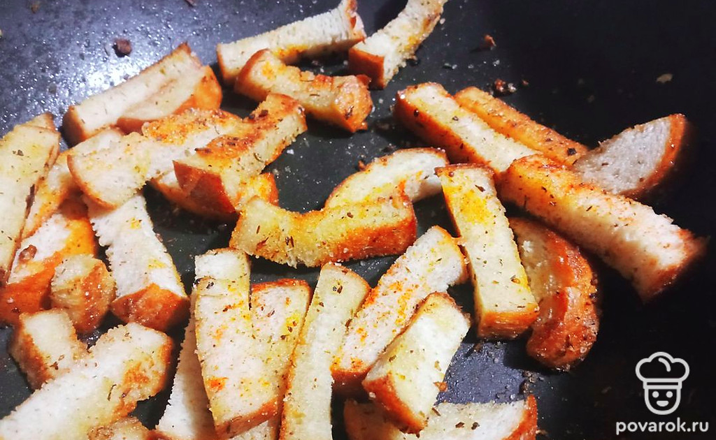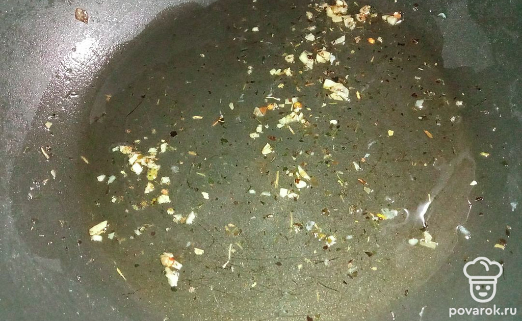 Брусочки обжариваем на чесносном масле с добавлением специй (паприка, острый перец).