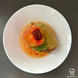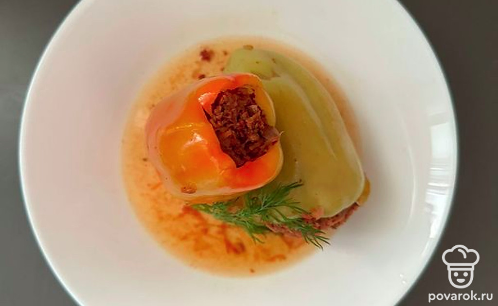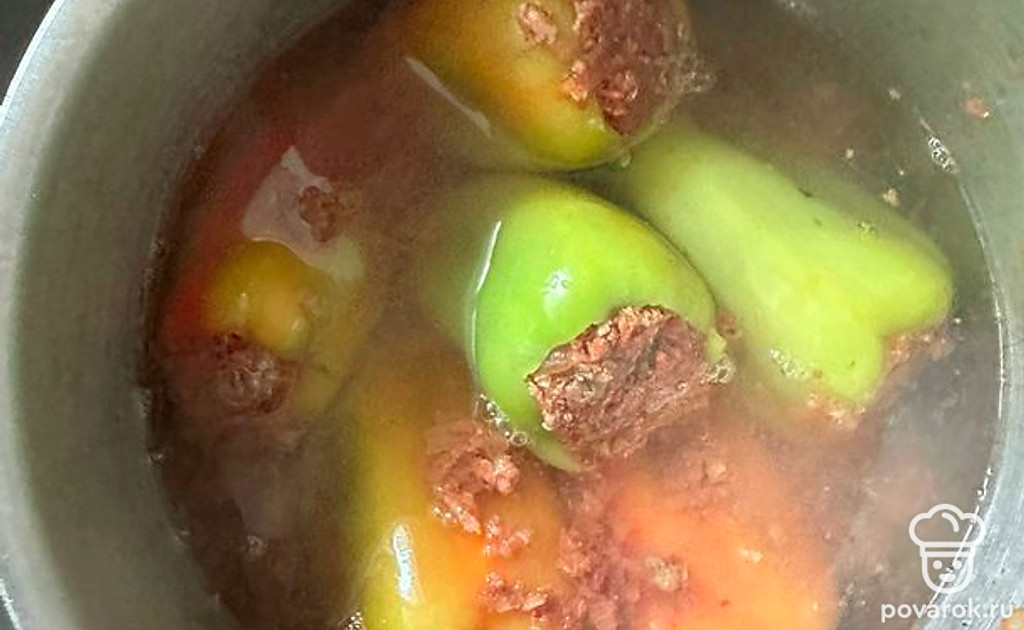 Удалить из перца сердцевину, заполнить начинкой из фарша. Выложить в кастрюлю, залить горячей водой и варить 30 минут.