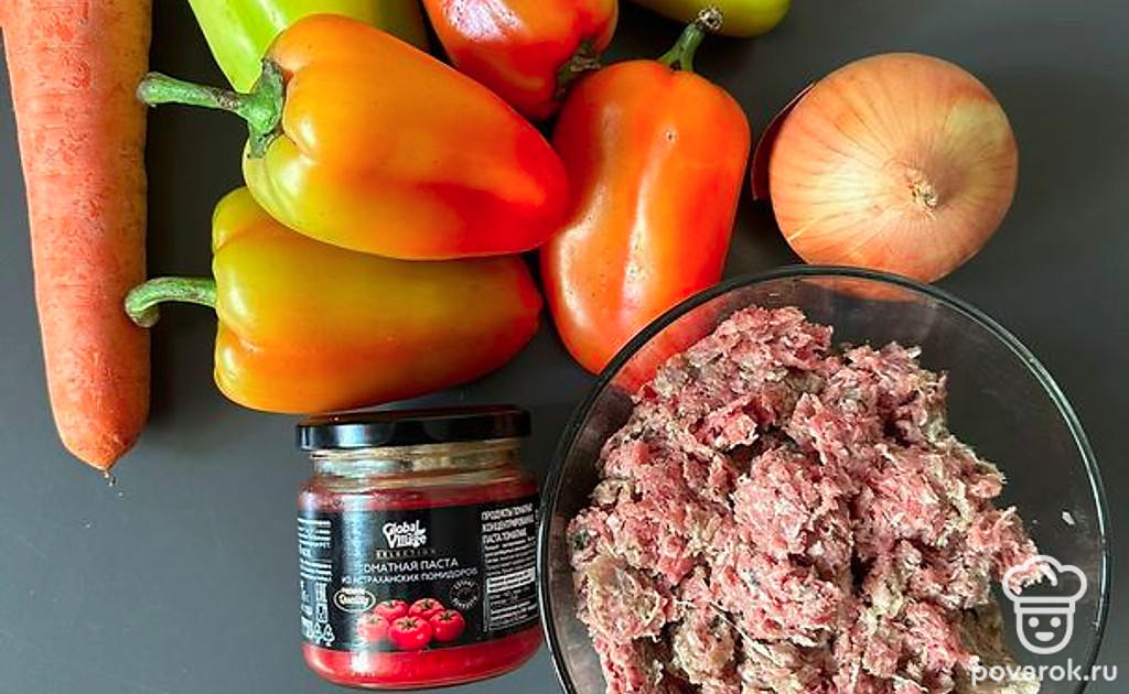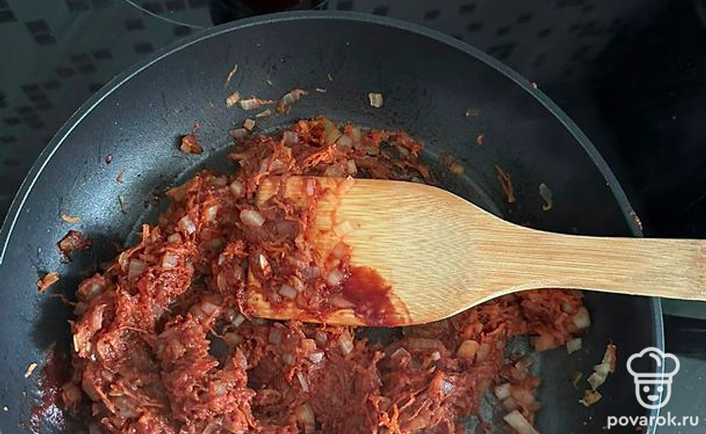 Нарезать лук, натереть морковь. Обжарить овощи, добавить фарш и томатную пасту. Потушить, добавить специи по вкусу.
