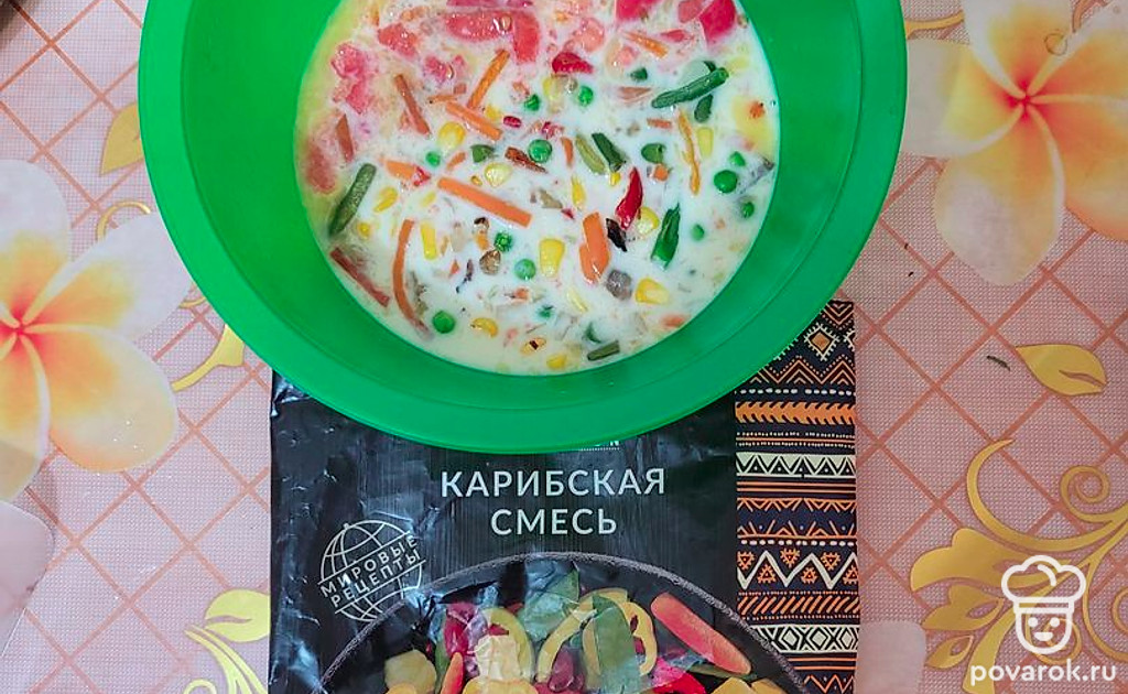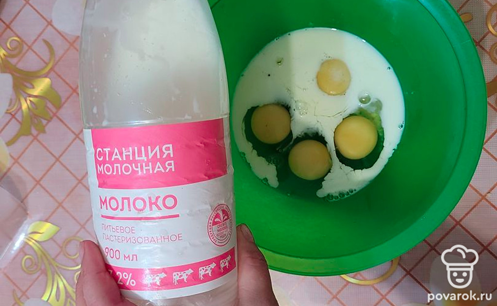В глубокой миске смешать яйца с молоком, посолить.