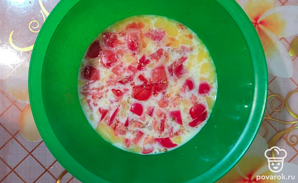 Помидор нарезать небольшими кубиками, добавить в яичную смесь.