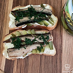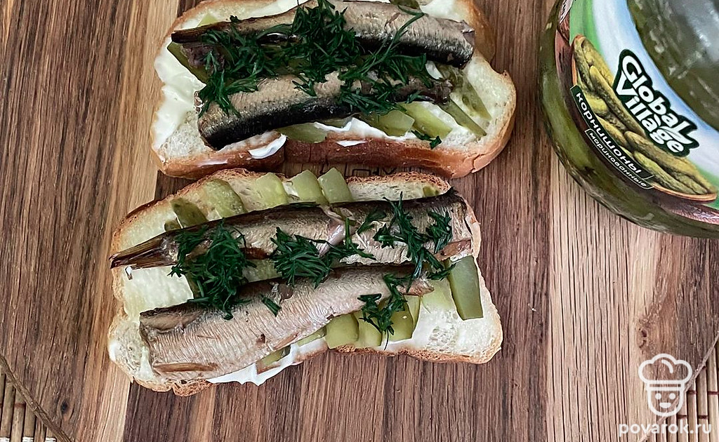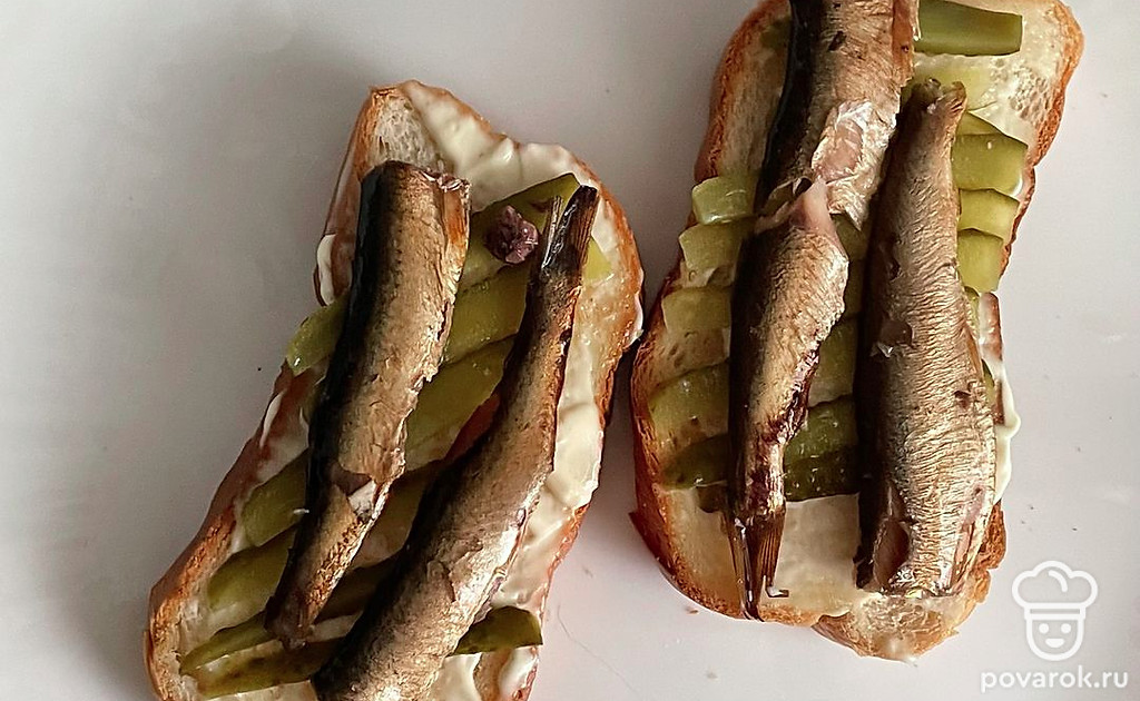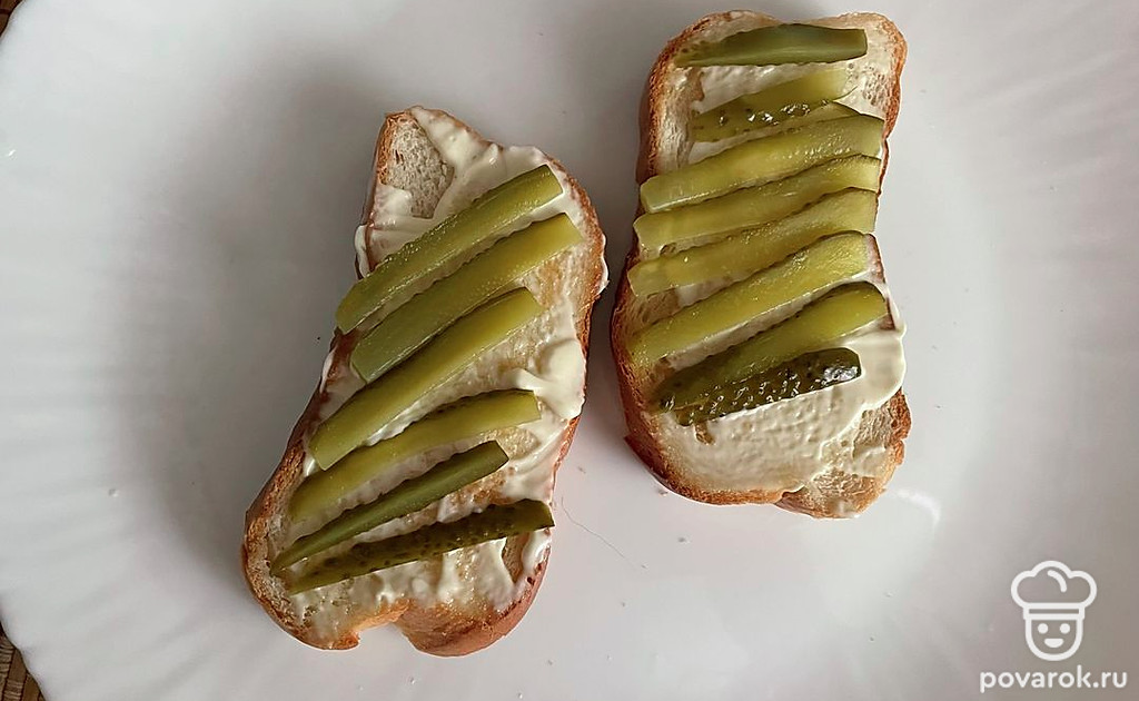 Смажьте хлеб майонезом, сверху выложите полоски огурца.