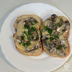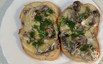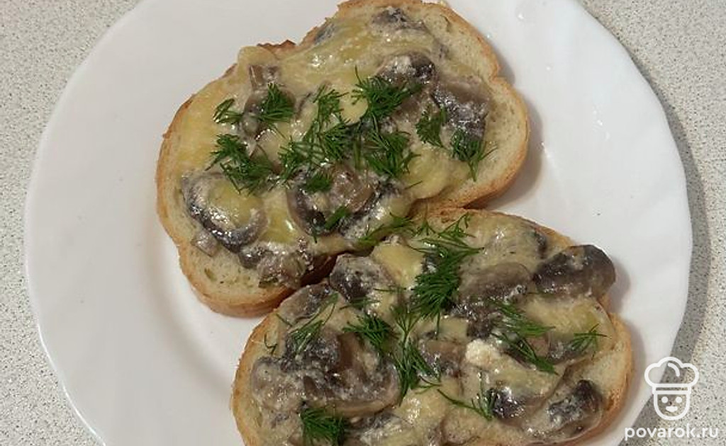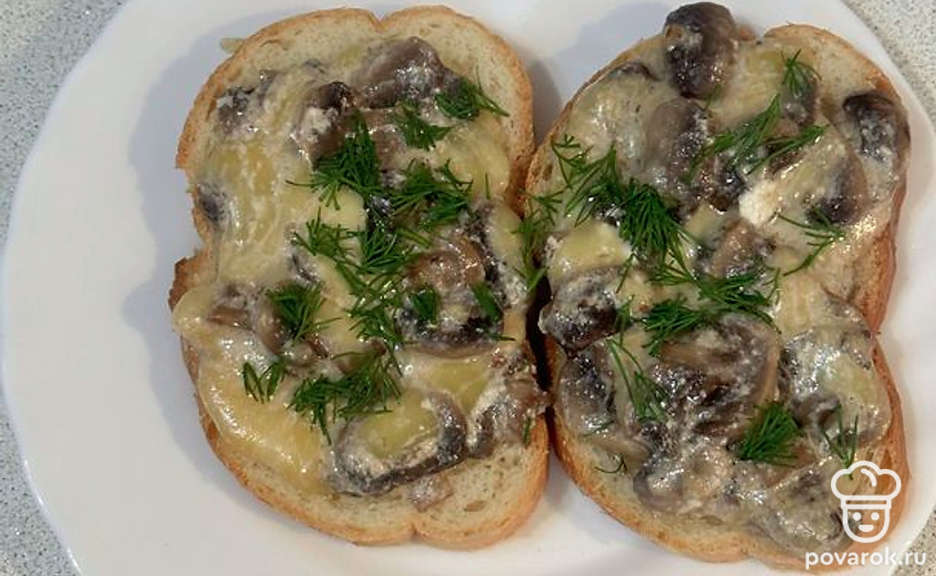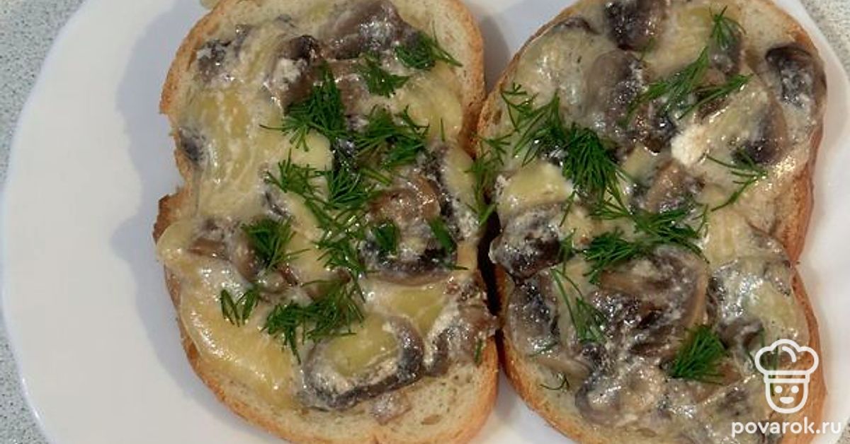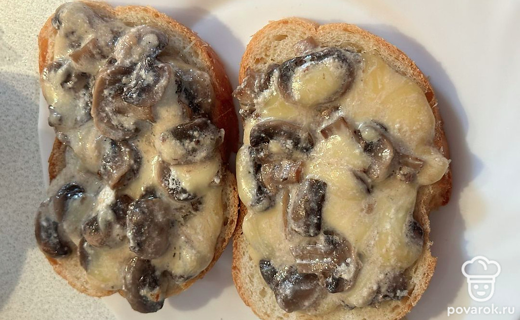 Горячую грибную смесь выкладываем на ломтики хлеба.