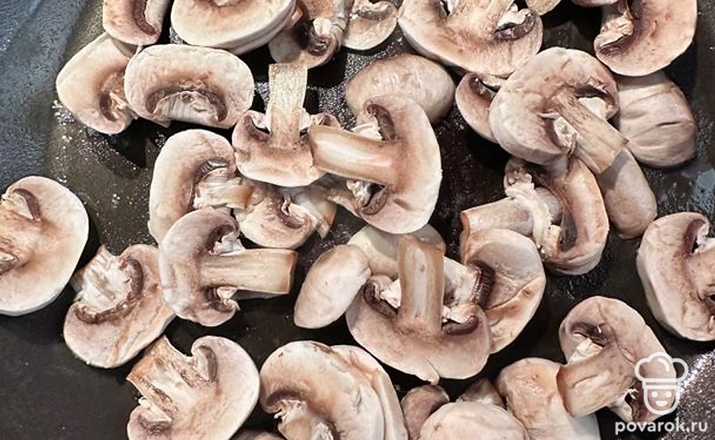 В сковороду наливаем растительное масло, выкладываем очищенные и мелко нарезанные шампиньоны.