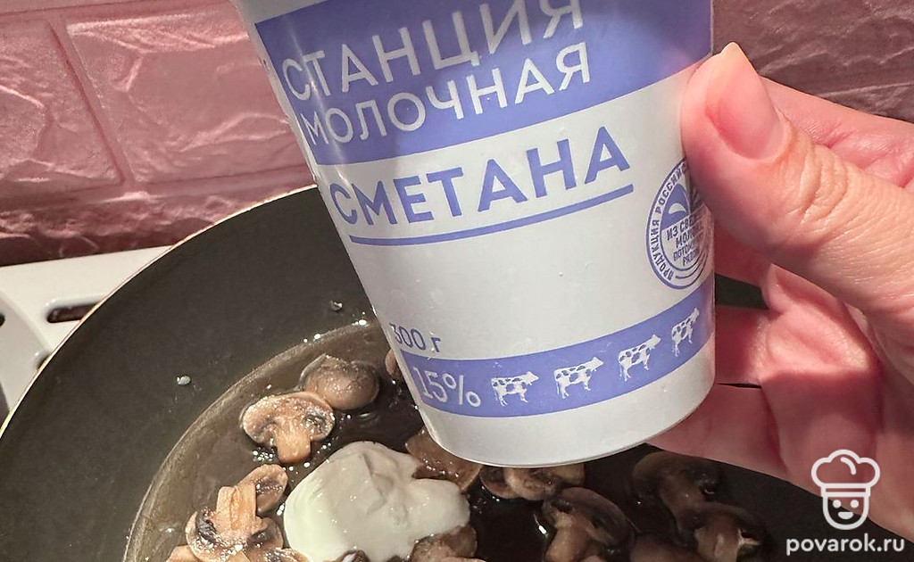 Обжариваем в течение 5 минут на среднем огне, периодически помешивая. Добавляем сметану, соль и перец.