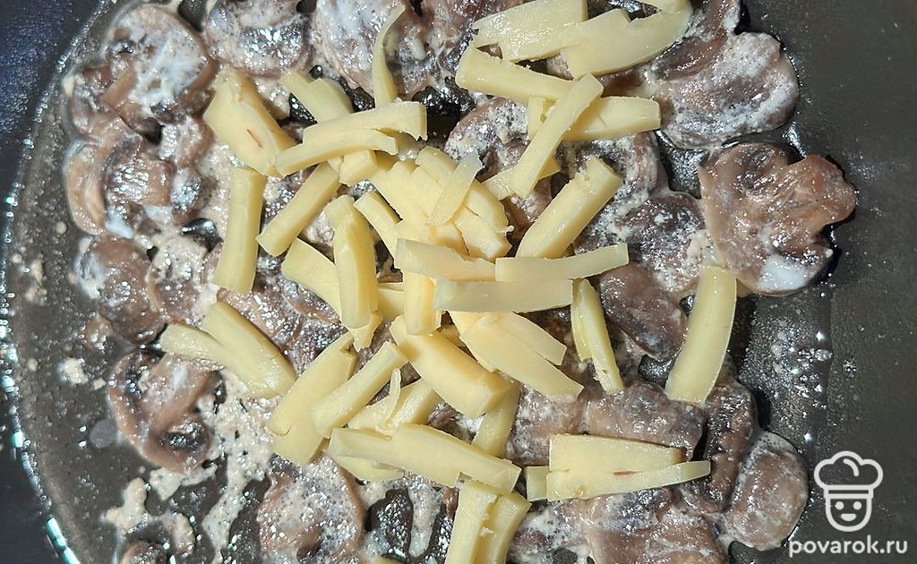 К обжаренным шампиньонам добавляем мелко нарезанный сыр. Выключаем плиту.