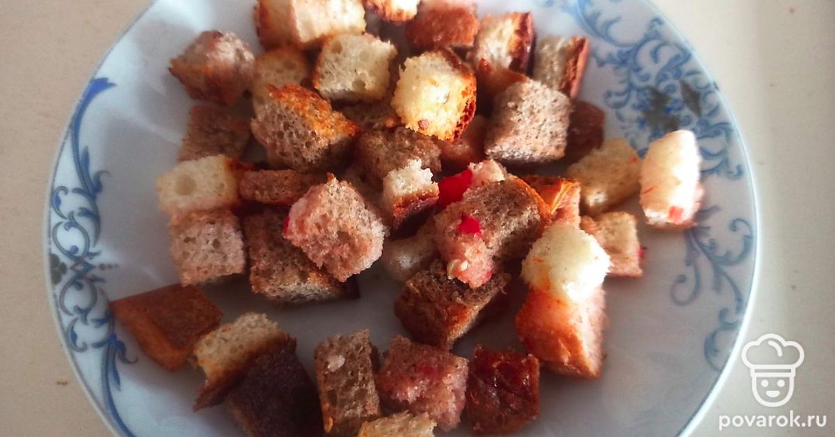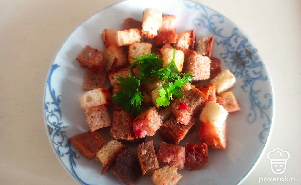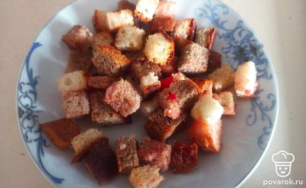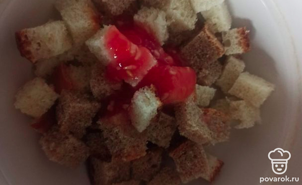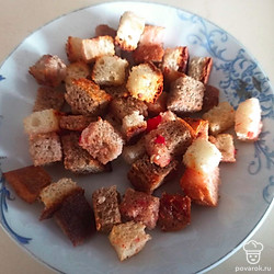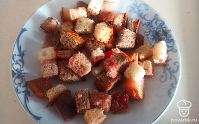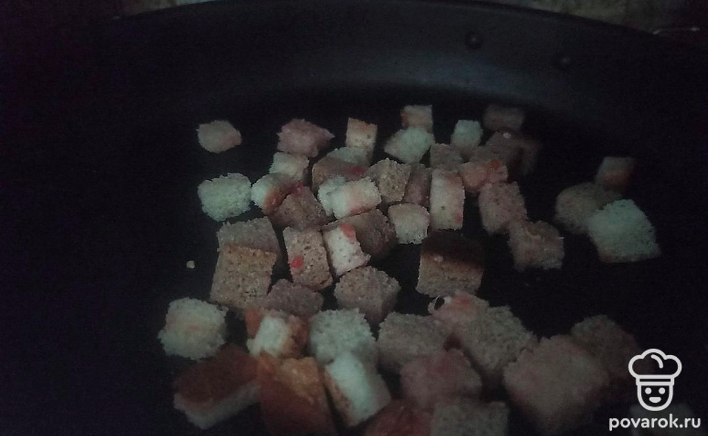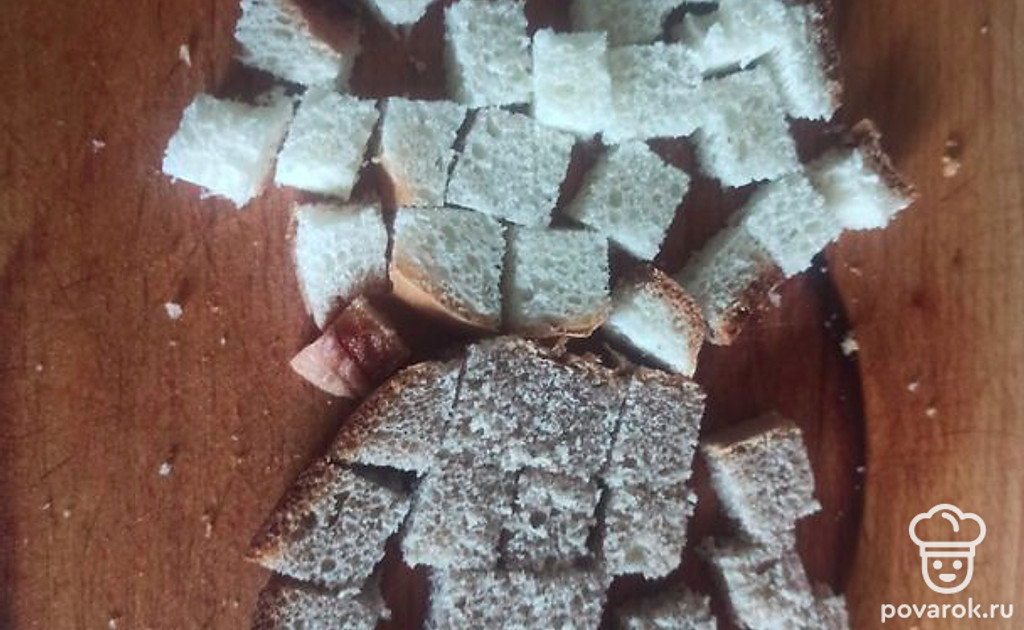 Серый и белый хлеб нарежьте маленькими кубиками.