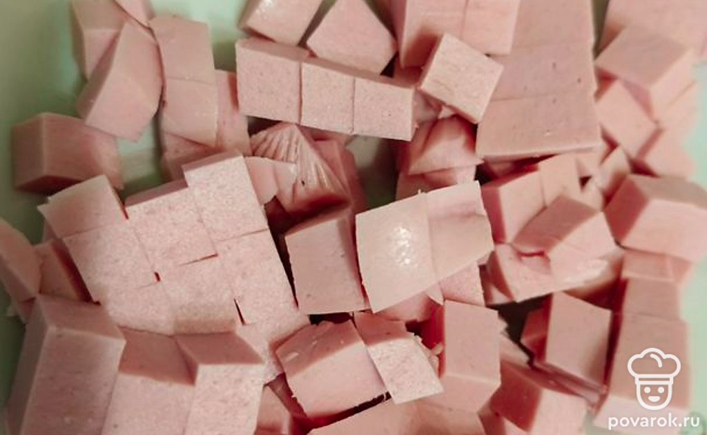 Нарезаем колбасу кубиками.