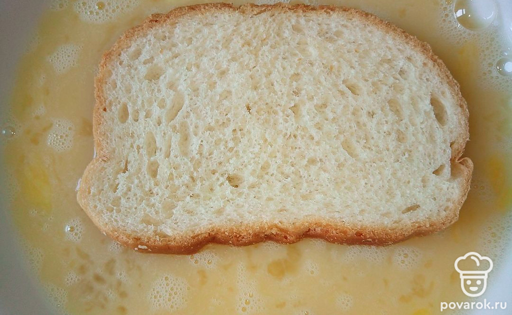 Нарежьте 4 куска багета и обмакните их в яичную массу с сахаром и солью.
