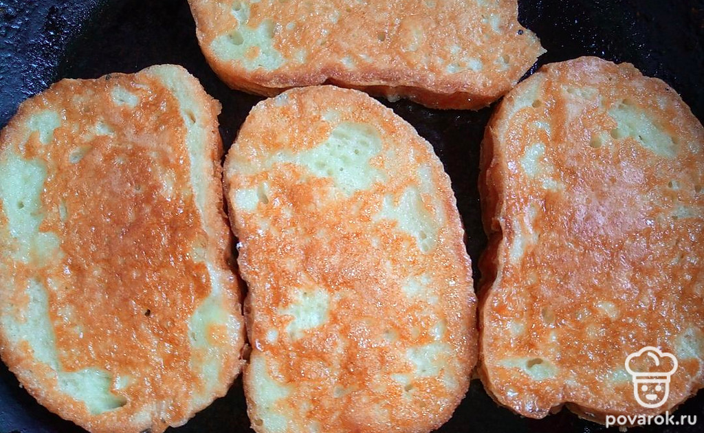 Разогрейте растительное масло на сковороде. Обжаривайте яичные гренки с двух сторон, до румяной корочки.