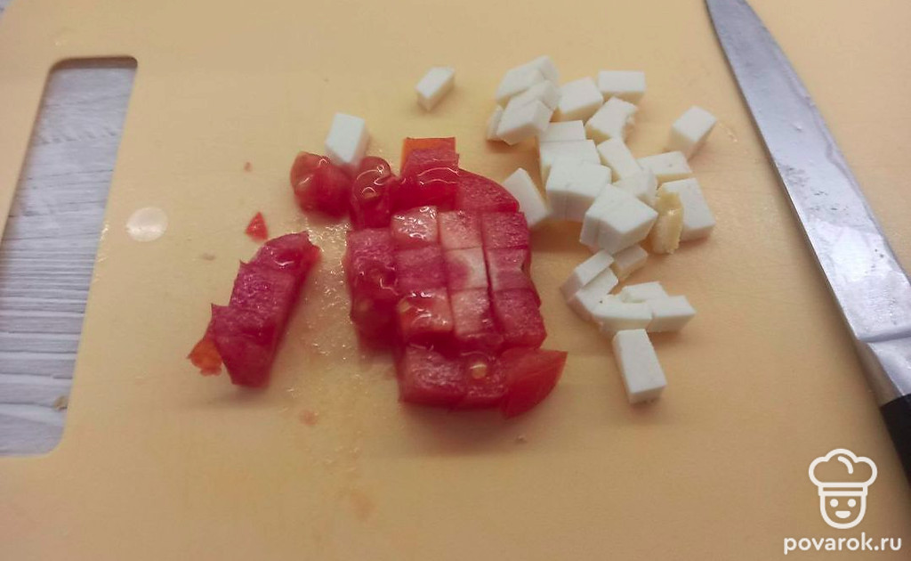 Помидор и сыр нарезаем кубиками.