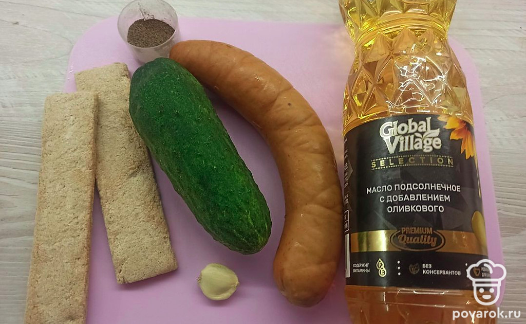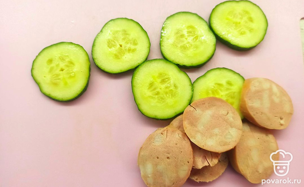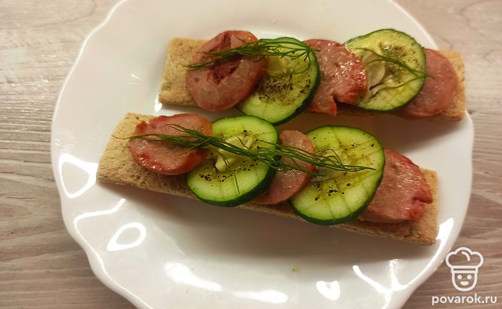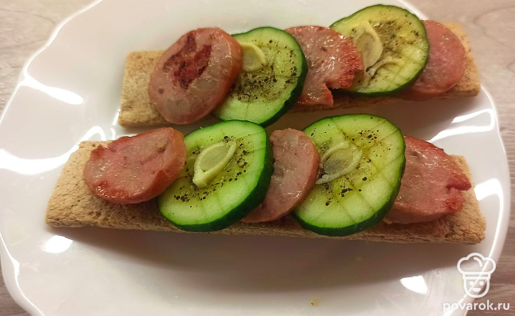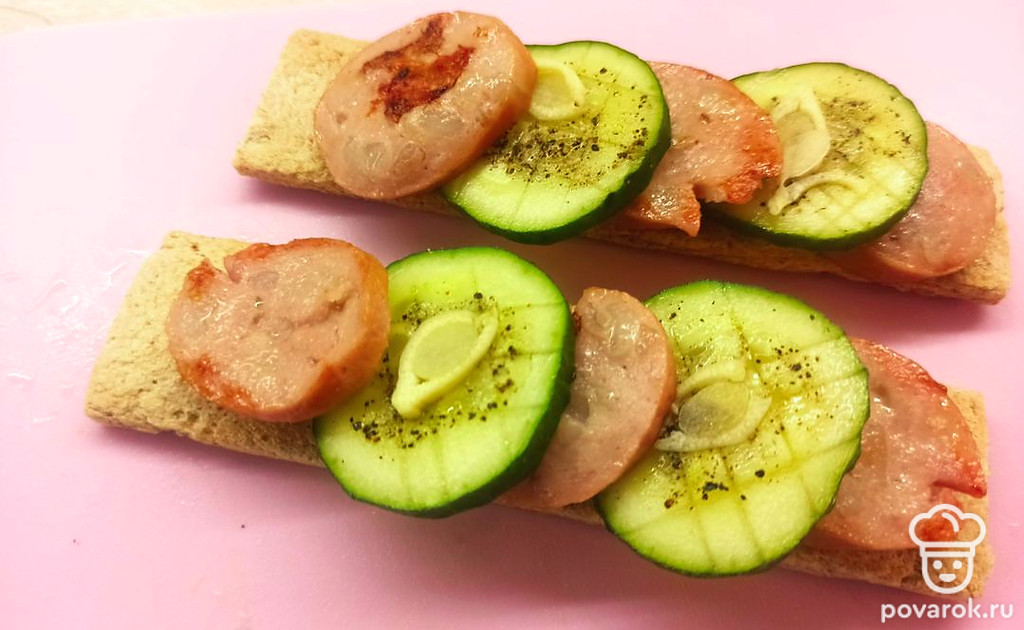 Выложите поочередно жареную колбасу и огурец на хлебцы (как на фото).
