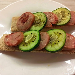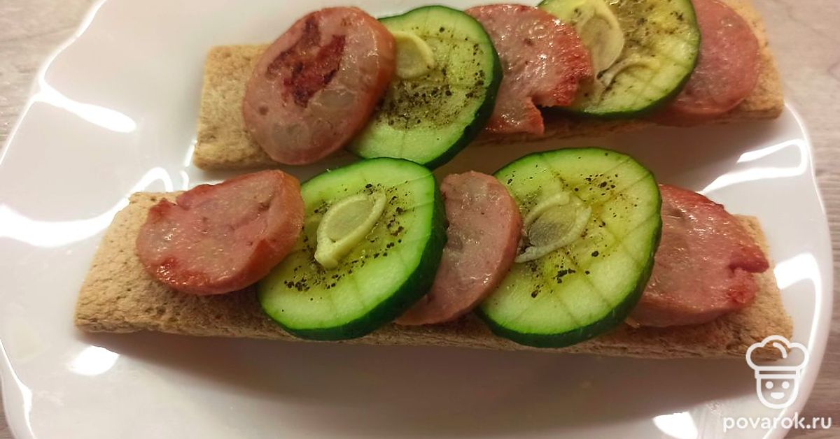 Вкусная и аппетитная закуска на хлебце с жареной колбасой и огурцом.