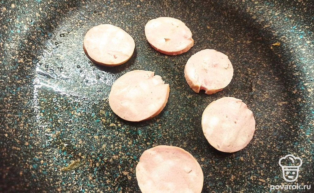 Колбасу обжарьте на подсолнечном масле с двух сторон по 2 минуты.