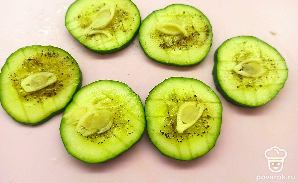 На огурце сделайте надрезы, натрите солью и перцем, сверху выложите дольки чеснока.