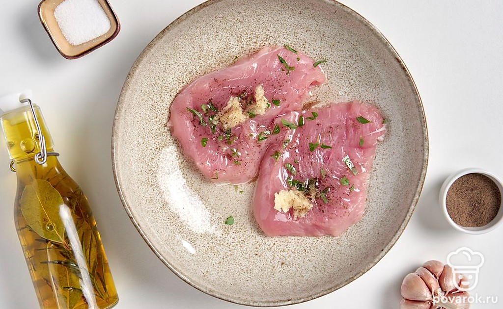 Подготовьте эскалопы. Базилик мелко нарежьте. Чеснок пропустите через пресс. В миску выложите базилик, чеснок и оливковое масло. Эскалопы посолите, поперчите и смажьте маслом со специями и чесноком.