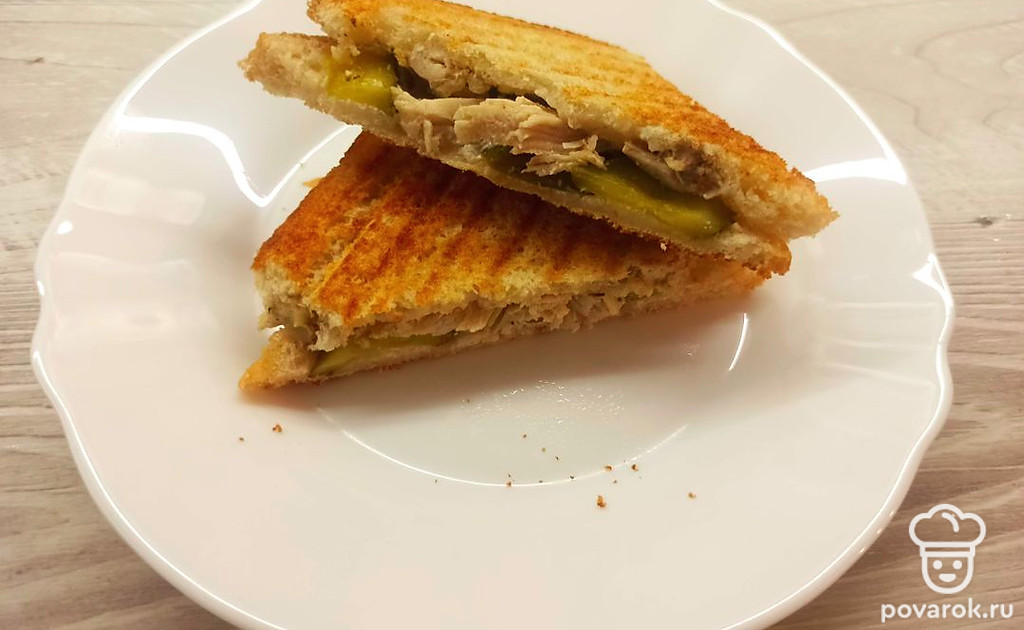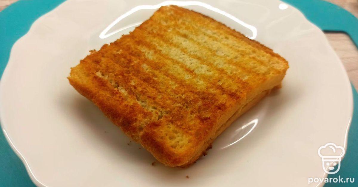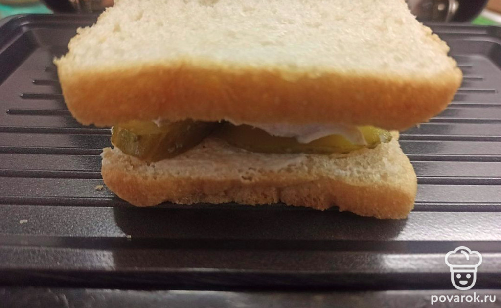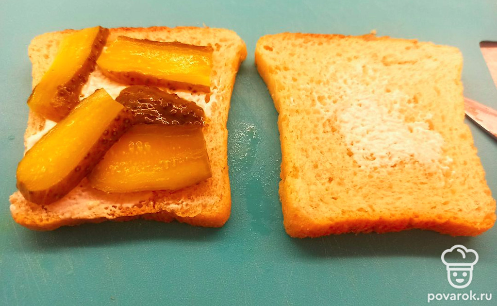 Хлеб для тостов намажьте сметаной, сверху выложите нарезанные тонкими ломтиками корнишоны.