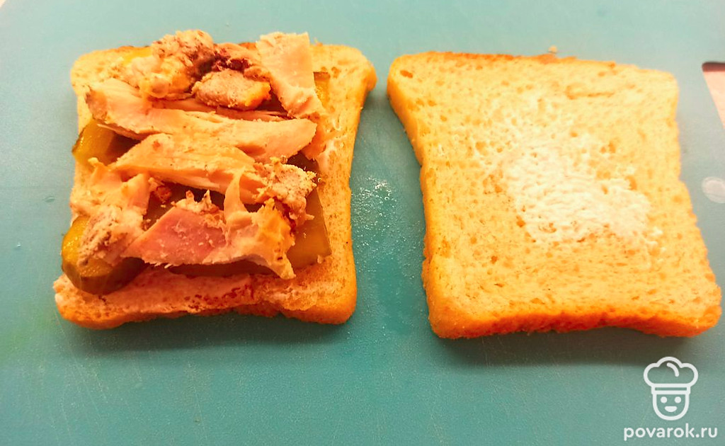 Курицу отварите в кипящей воде до готовности (15-20 минут). Затем отделите мясо от кости и выложите на тост.