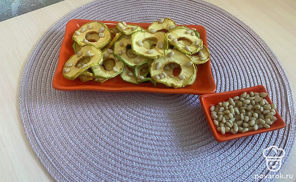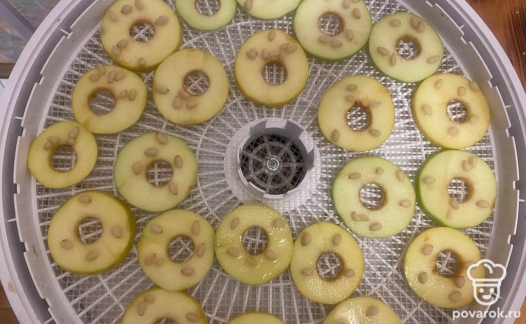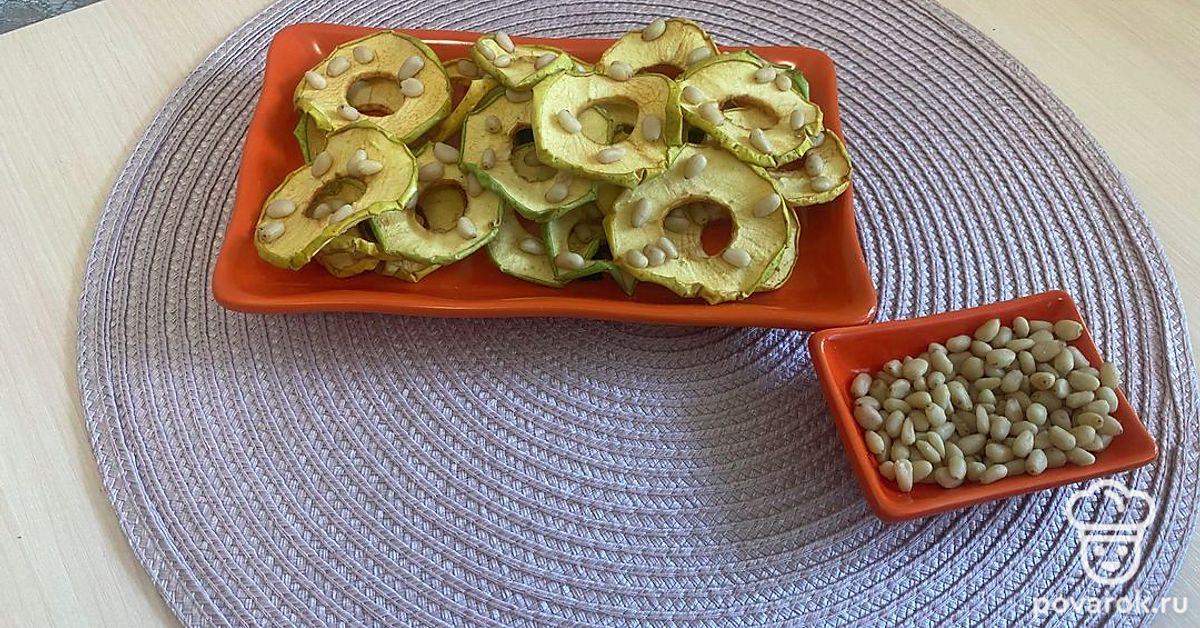 Сверху каждый ломтик аккуратно посыпьте орешками. Включите на 45 градусов и оставьте на 12 часов.