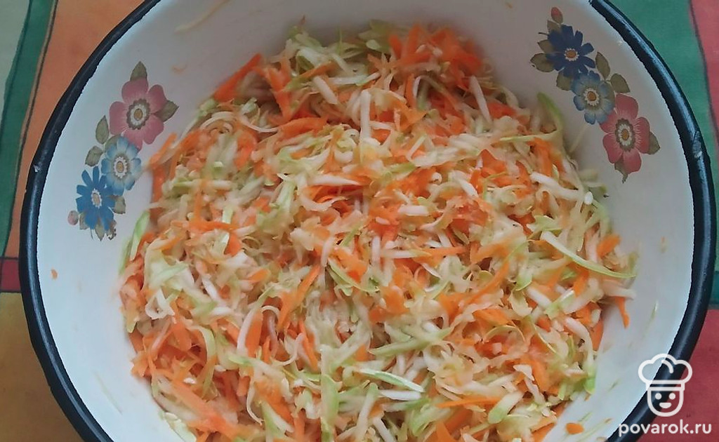 На крупной терке натереть кабачок, морковь. Посолить. Оставить на 15 минут.