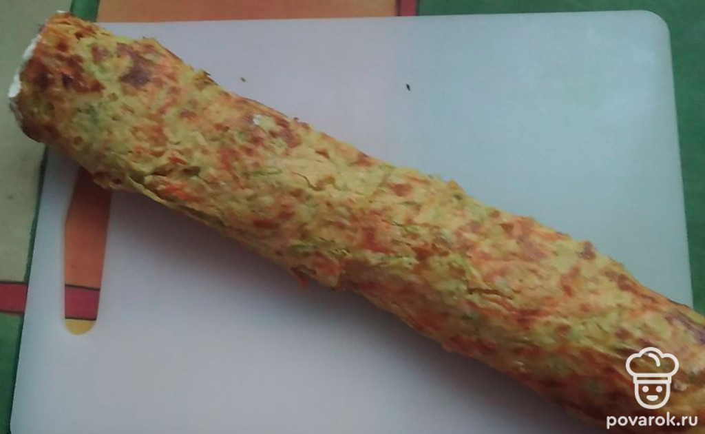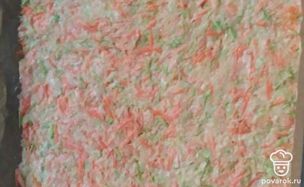Отжать жидкость. Добавить яйца, крахмал, муку и хорошо перемешать. Противень застелить хорошей бумагой для выпечки. Смазать маслом и выложить смесь, разровнять. Выпекать примерно 25 минут при температуре 200 градусов.