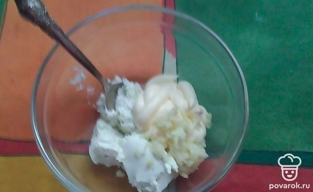 В миску выложить творожный сыр, добавить майонез, выдавить чеснок. Перемешать.