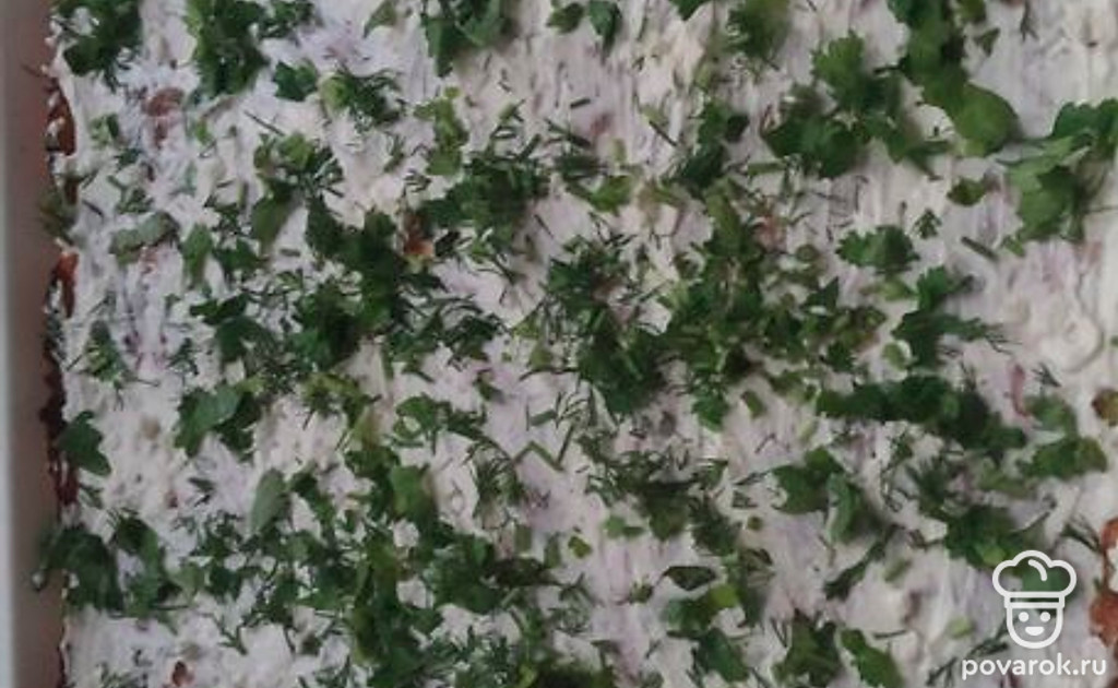 Остывший корж смазать творожной смесью, посыпать зеленью.