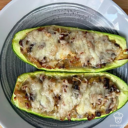 Достаем лодочки из духовки и фаршируем. Сверху посыпаем тертым сыром. Отправляем в духовку на 15 минут при 170 градусах.