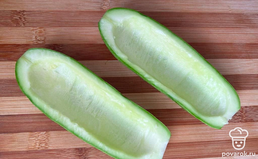 Кабачок разрезаем вдоль, чтобы получились лодочки, и ложкой вынимаем серединку. Посыпаем солью и ставим в духовку на 10 минут при 170 градусах.