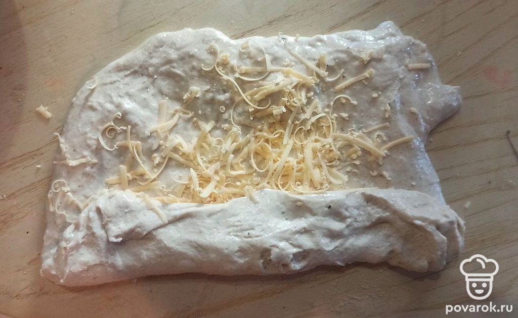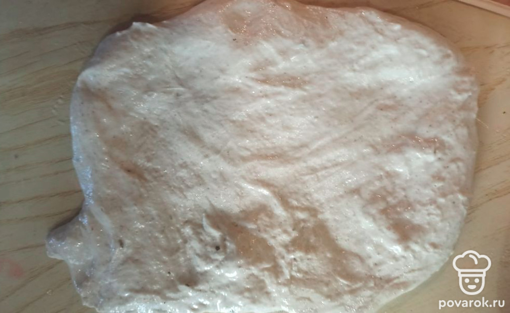 Смешать воду, закваску, муку. Через полчаса добавить соль и тщательно вымесить тесто. Оставить на 3 часа.