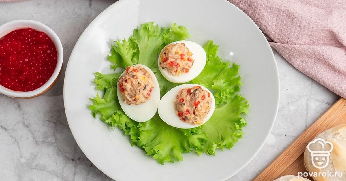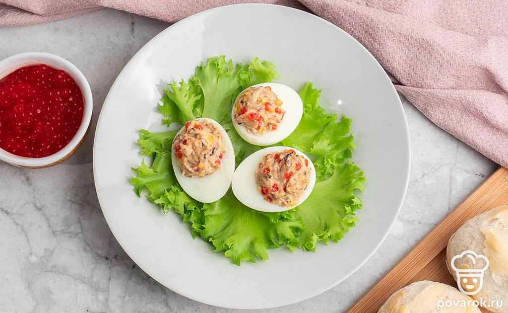 Подавайте фаршированные яйца со шпротами, красной икрой и сыром со свежеиспеченным хрустящим хлебом. Ваши гости точно придут в полный восторг!