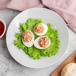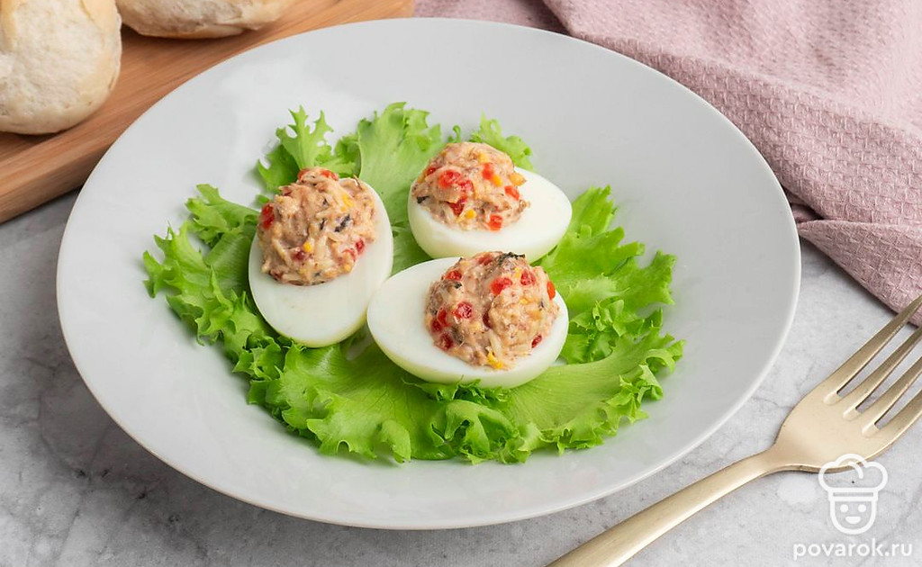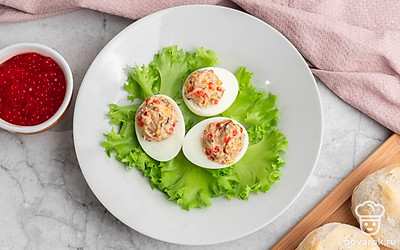 Возьмите красивую тарелку, выложите её листьями салата, а затем положите сверху готовые фаршированные яйца. Всё готово, можно подавать!