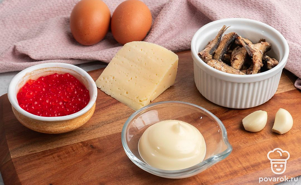 Интересная и довольно необычная версия традиционной холодной закуски. Здесь в качестве наполнителя используются подкопченные шпроты, деликатесная красная икра и нежный сыр.