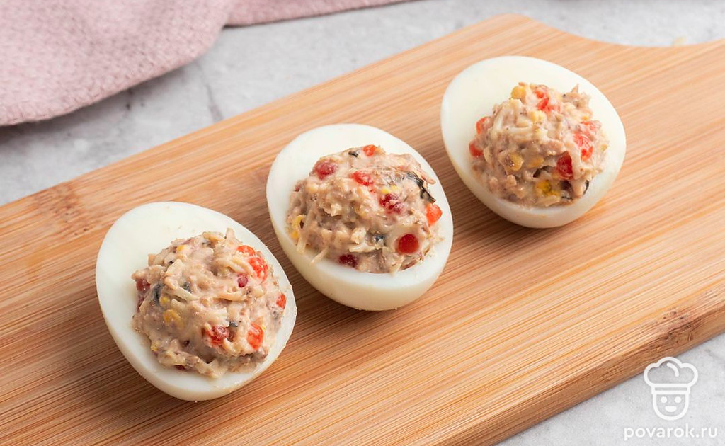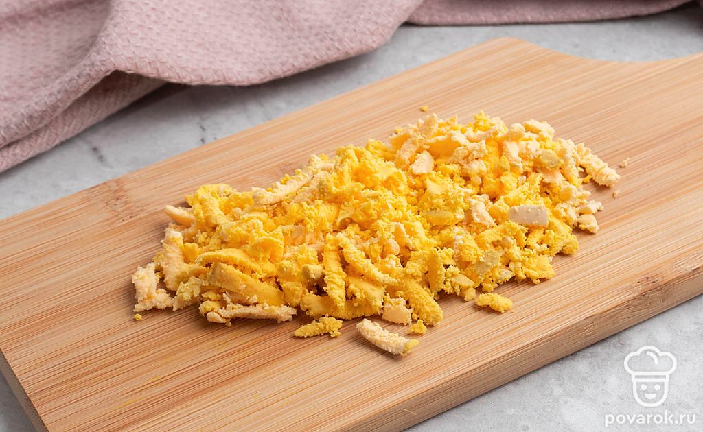 Очистите яйца от скорлупы, аккуратно разрежьте вдоль на две половины и удалите желтки. Белки отложите в сторону, а желтки измельчите.