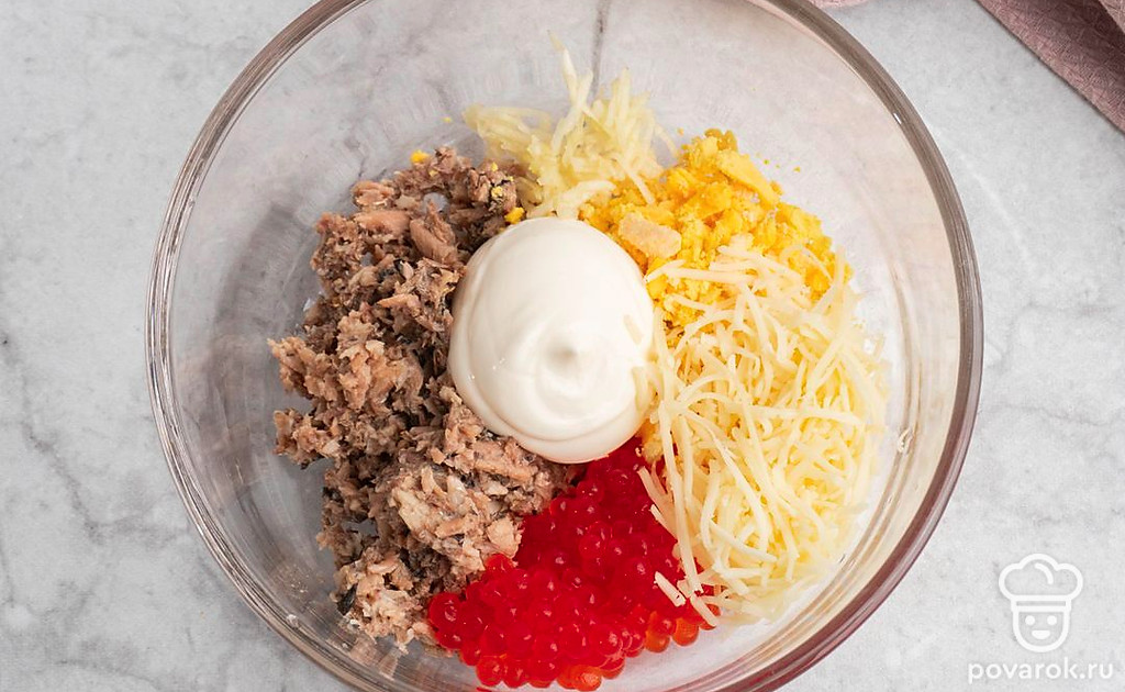 Натрите сыр на тёрке, измельчите чеснок. В глубокой удобной посуде смешайте желтки, сыр, шпроты и икру. Добавьте майонез и как следует перемешайте.