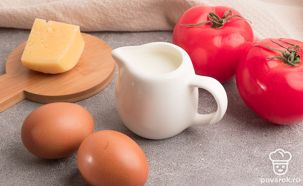 Приготовьте необходимые ингредиенты. Помидоры хорошенько помойте и обсушите. Отмерьте необходимое количество молока и сыра.