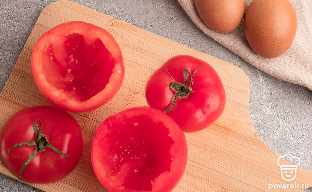У помидоров аккуратно срежьте верхушку и чайной ложкой осторожно удалите мякоть. Сформировав чашечку.