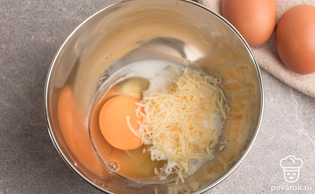 В миске соедините сыр, молоко и яйца. Перемешайте, используя вилку, так сыр распределится более равномерно.