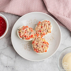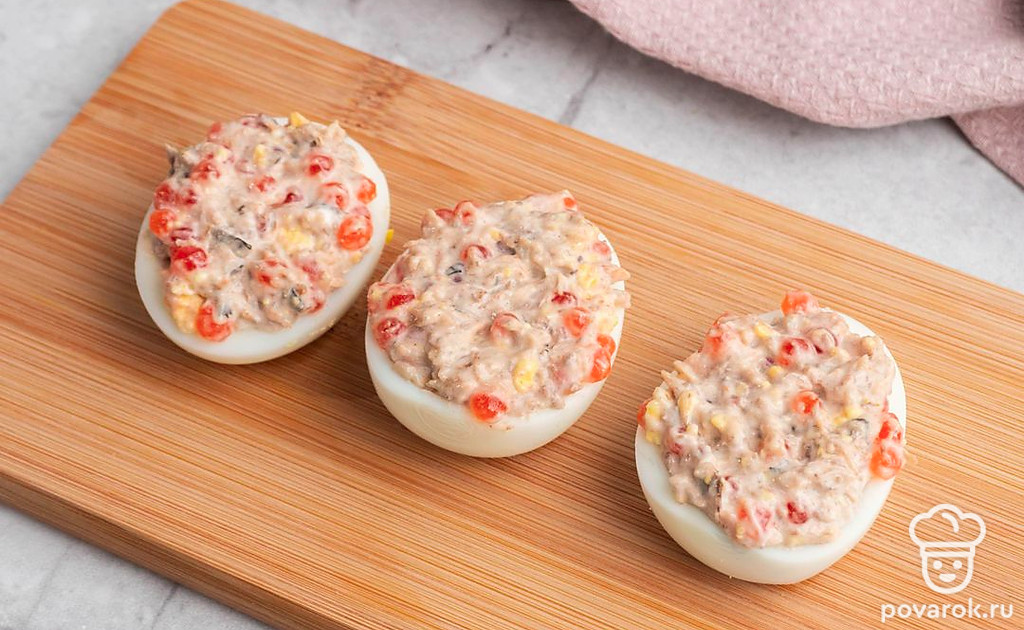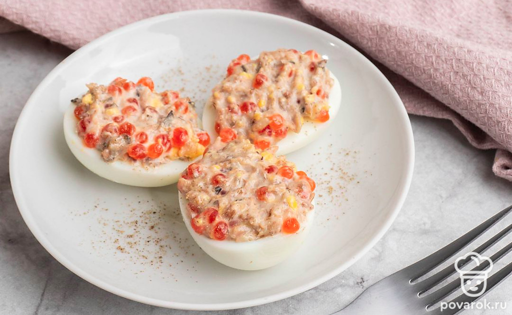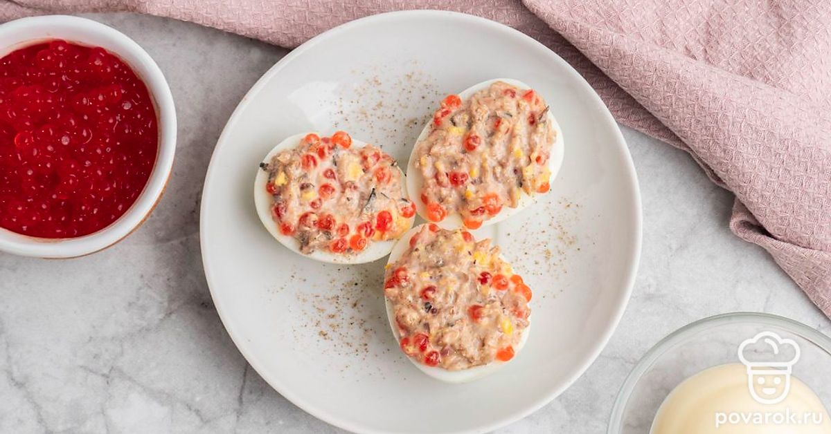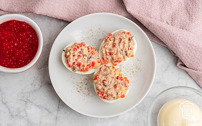 Всё готово! Переложите готовые фаршированные яйца на красивую тарелку и подавайте к столу!