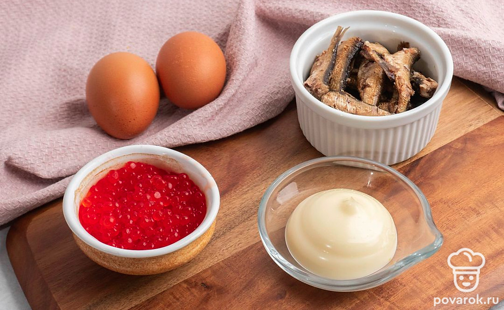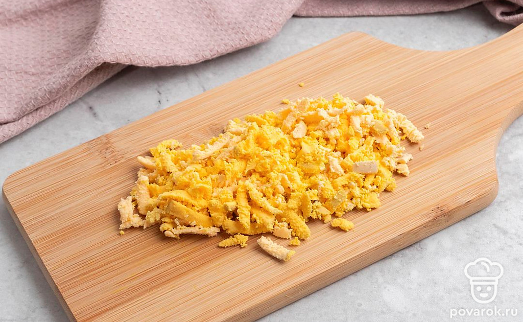 Заранее отварите яйца «вкрутую». Подготовьте все ингредиенты и разложите их перед собой на столе ⎯ так будет значительно удобнее заниматься готовкой.