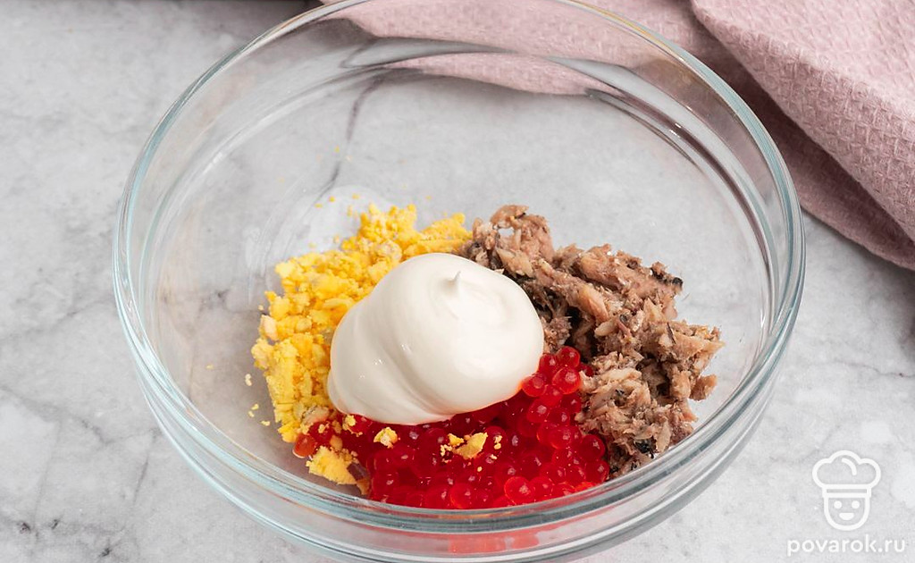 Возьмите удобную глубокую миску и положите в неё измельченные желтки, шпроты и икру, добавьте майонез. Тщательно перемешайте.