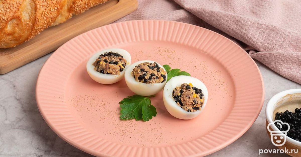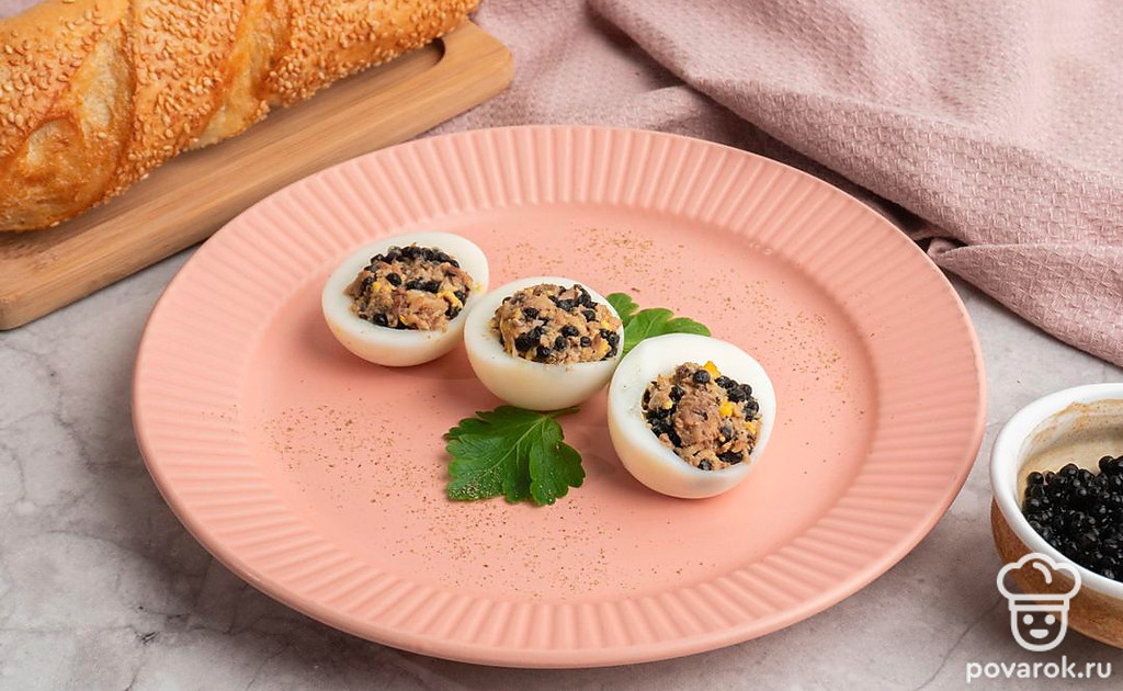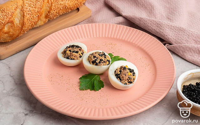 Идеальным дополнением для яиц, фаршированных шпротами, черной икрой и чесноком станет свежий хрустящий хлеб. Ваши близкие и друзья точно по достоинству оценят это необычное блюдо!