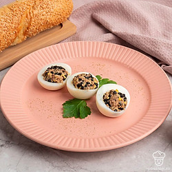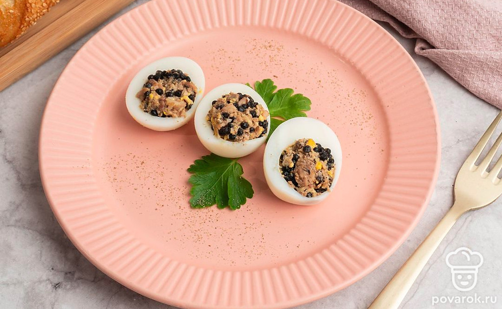 Блюдо готово! Возьмите красивую тарелку, выложите на неё фаршированные яйца и украсьте их листочками петрушки. Можно подавать к столу!