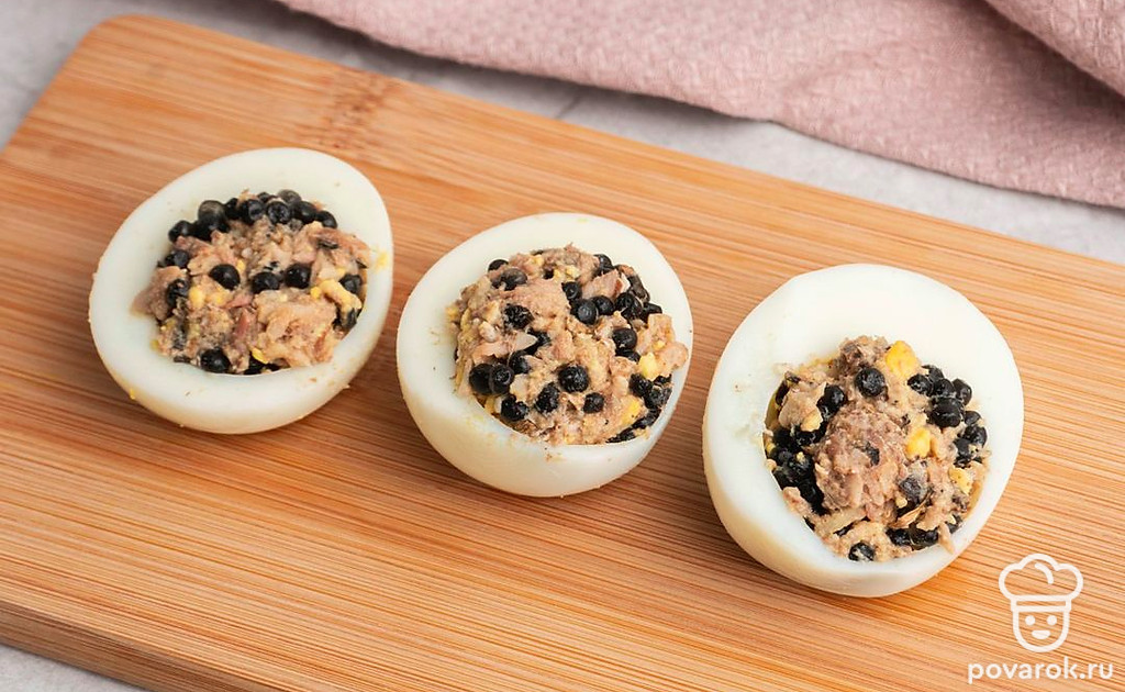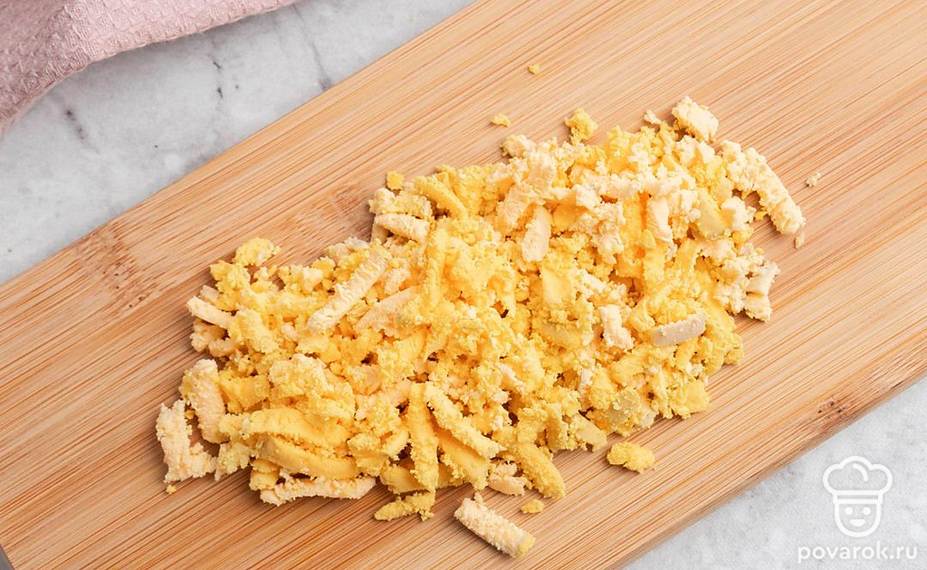 Аккуратно очистите яйца от скорлупы, а затем каждое разрежьте вдоль на две части. Удалите желтки и измельчите их, белки отложите в сторону ⎯ они понадобятся чуть позже.