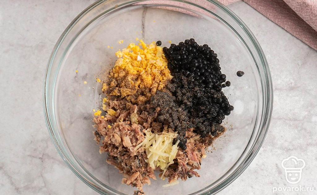 Натрите чеснок на терке или воспользуйтесь давилкой для чеснока. В глубокой удобной миске смешайте желтки, икру и чеснок. Добавьте немного черного молотого перца и щепотку соли. Тщательно всё перемешайте.